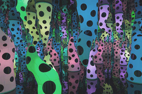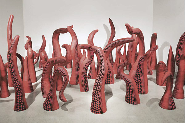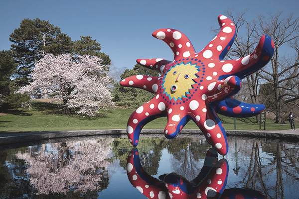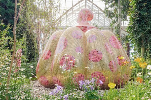 야외 설치 조각에 폴카도트와 호박 등 쿠사마의 상징적 소재가 활용되어 그녀의 독특한 미적 세계의 전시